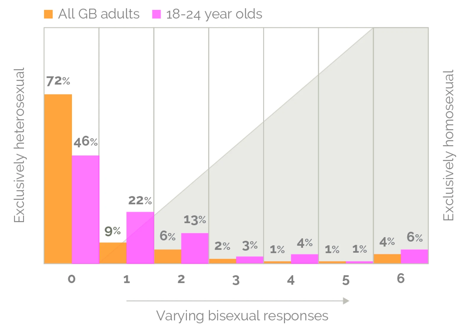 Kinsey came up with a simple 7-point scale, intending to show that sexuality is fluid – and more importantly, that it can change. First, I want to show you responses from a 2015 survey of people from the UK: